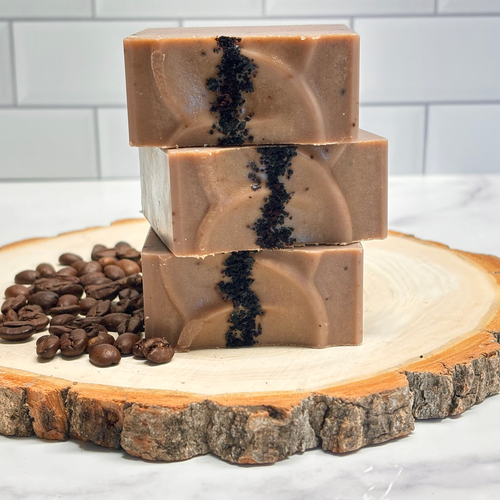 Ingredients: Olive Oil, Rice Bran Oil, Coconut Oil, Distilled Water, Sodium Hydroxide (Lye), Coconut Milk, Fragrance, Kaolin Clay, Cocoa Powder, Coffee Grounds, Coffee Beans.