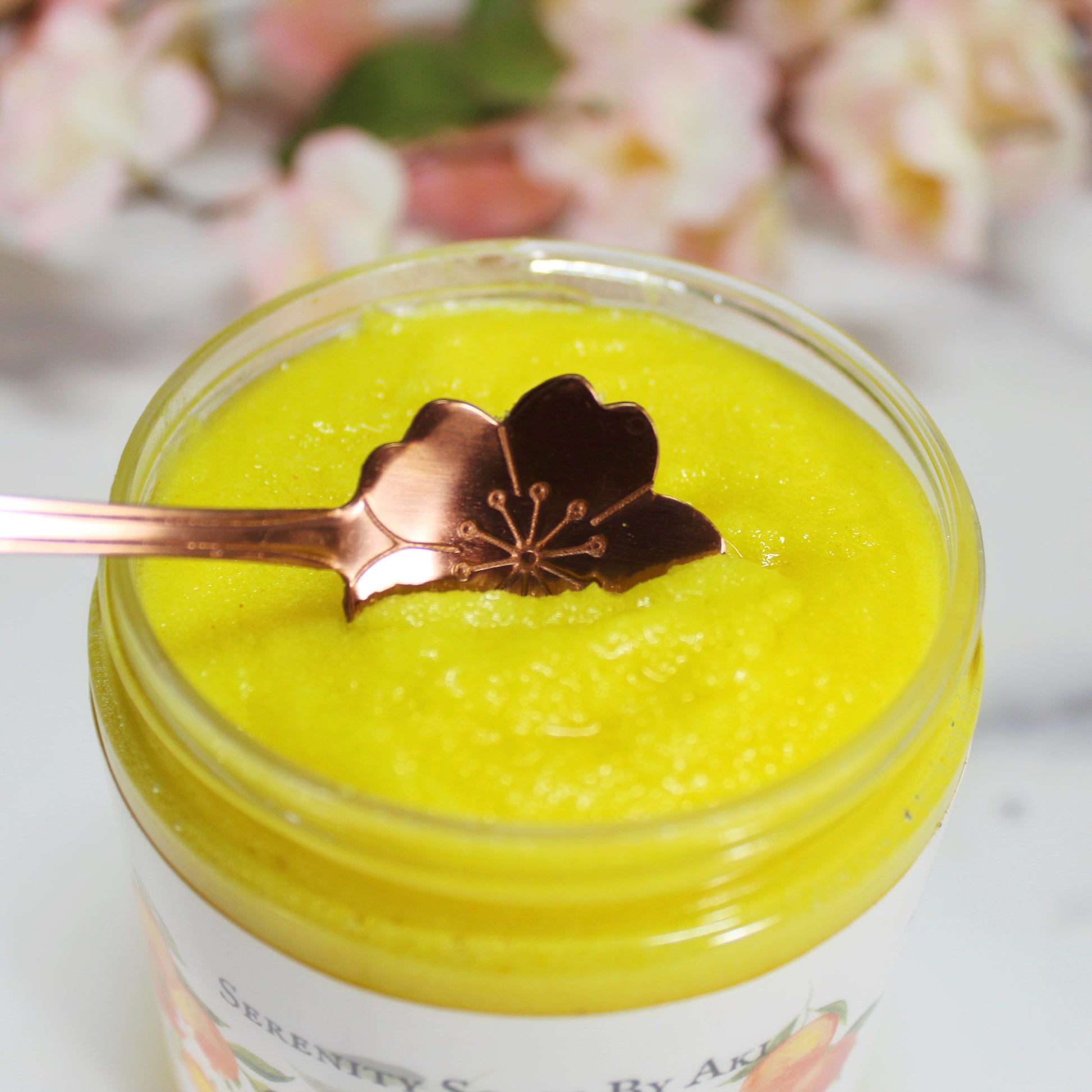 Ingredients: Pure Cane Sugar, Shea Butter, Coconut Oil, Avocado Oil, Organic Turmeric Powder, Emulsifying Wax NF, Optiphen, Orange Essential Oil.