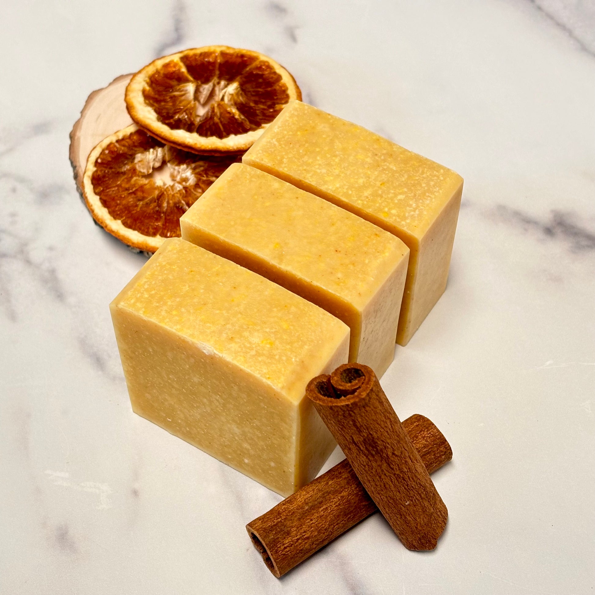 Ingredients: Canola Oil, Sunflower Oil, Coconut Oil, Distilled Water, Sodium Hydroxide (Lye), Sweet Orange Essential Oil, Turmeric Powder, Kaolin Clay, Cinnamon Bark Essential Oil, Mica.